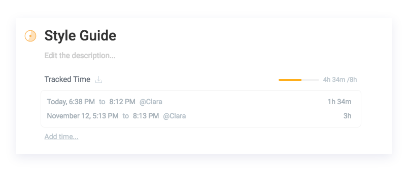 You can manage all time entries, add time manually or download a CSV of all timers inside the task.